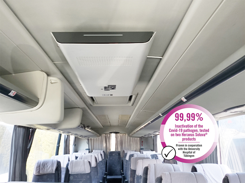 VireWall Soluva® Air V jest przeznaczona do dezynfekcji powietrza światłem UV-C w autobusach i innych środkach transportu publicznego. W sposób ciągły oczyszcza powietrze w kabinie autobusów i innych środków transportu publicznego podczas jazdy – niezawodnie i wydajnie. Wirusy, ich mutanty, bakterie i inne patogeny są natychmiast niszczone. Zostało to udowodnione przez Instytut Fraunhofera. Urządzenie do oczyszczania powietrza UV-C montuje się po prostu na suficie kabiny pasażerskiej. Zwiększa to ochronę Twoich pasażerów. Zastosowanie VireWall Soluva® Air V sprawdziło się już w wielu autobusach komunikacji miejskiej.